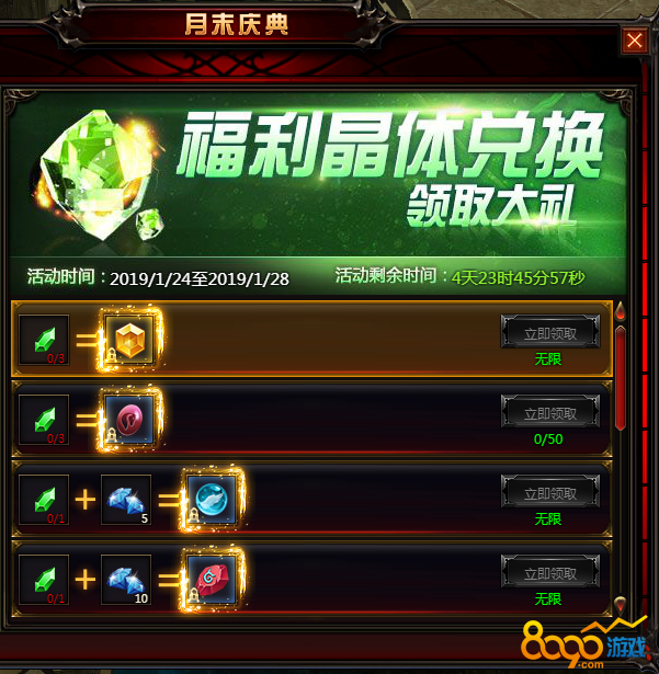 活动内容:玩家在日常挂机击杀小怪可获得小晶体,击杀野外BOSS、黄金BOSS、魔王BOSS(活动)都可获得中晶体,使用不同晶体及钻石比例可兑换游戏中稀有道具,详情请根据游戏中活动兑换页面为准。