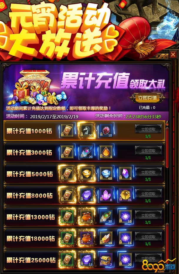 活动内容:活动时间内,玩家每日充值达到2000钻,即可获得丰厚奖励,BOSS卡、化灵石、宝石袋等着你!