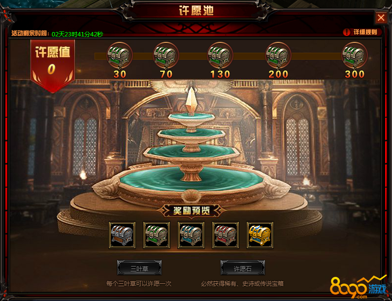 4.每次开启宝箱会根据宝箱稀有度获得相应的许愿值。(普通1点,优质2点,稀有5点,史诗8点,传说20点)