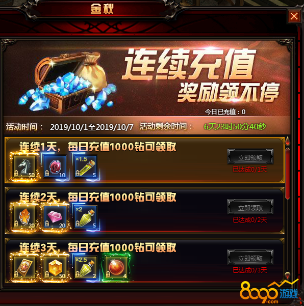 活动内容:活动时间内,玩家每日充值达到1000钻,即可获得丰厚奖励!