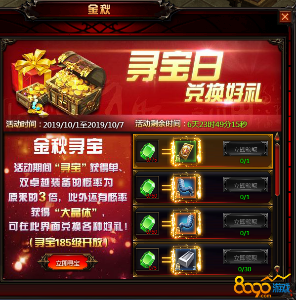 活动内容:在活动时间内,“寻宝”可获得单、双卓越装备的概率为原来的三倍,此外还有概率获得“大晶体”,大晶体可在金秋活动专属页面中兑换好礼!