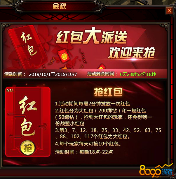 活动内容:玩家在活动期间,全服玩家同时抢金秋红包,每人每天最多抢10次,还有大大红包等你来抢!