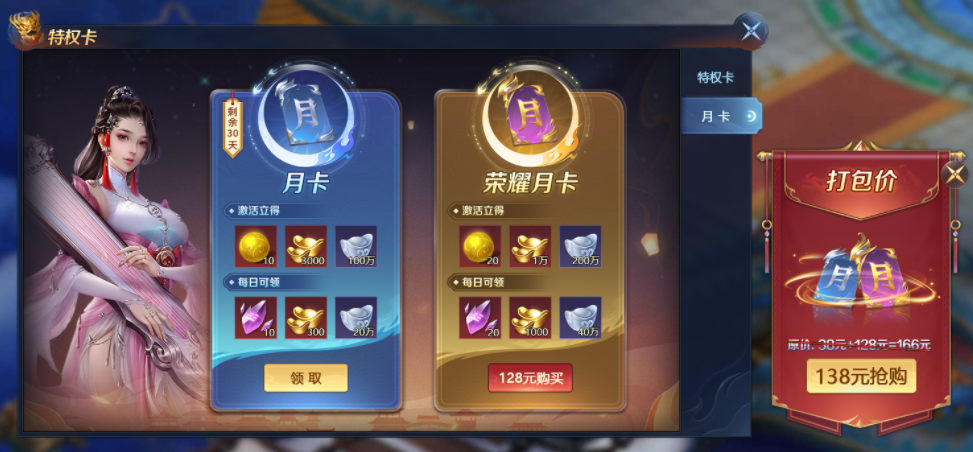 ② 有138元的合购价格,可以同时以优惠价同时购买月卡和荣耀月卡