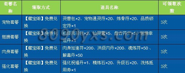 每套餐兑换券×1在【藏宝阁】处可免费兑换下列5种套餐中的任意一项!