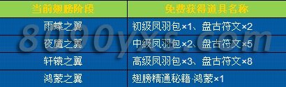 活动期间,只要您的翅膀进化到以下阶段,就能点击【藏宝阁】免费领取超值奖励!我是高手!我就要炫!