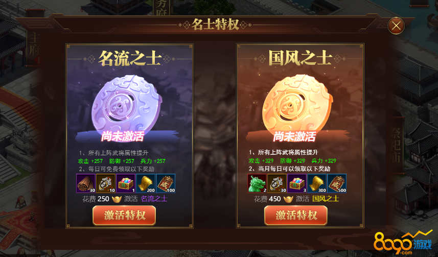 名士特权通过充值的元宝购买,购买成功后会增加全体上阵武将属性,每日还有福利可领取,全体上阵属性不能叠加,每日福利科叠加
