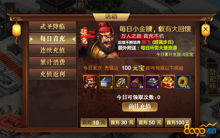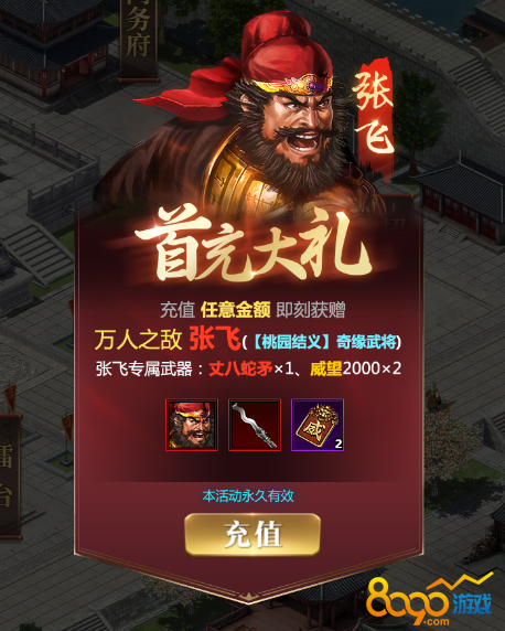 l 活动期间内,累计充值达到条件即可领取奖励,张飞武魂产出,竞马币产出,一些日常培养武将的资源