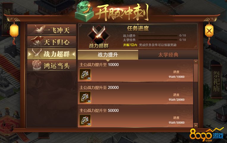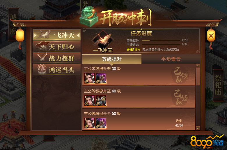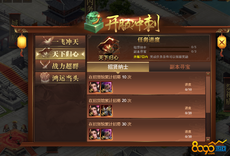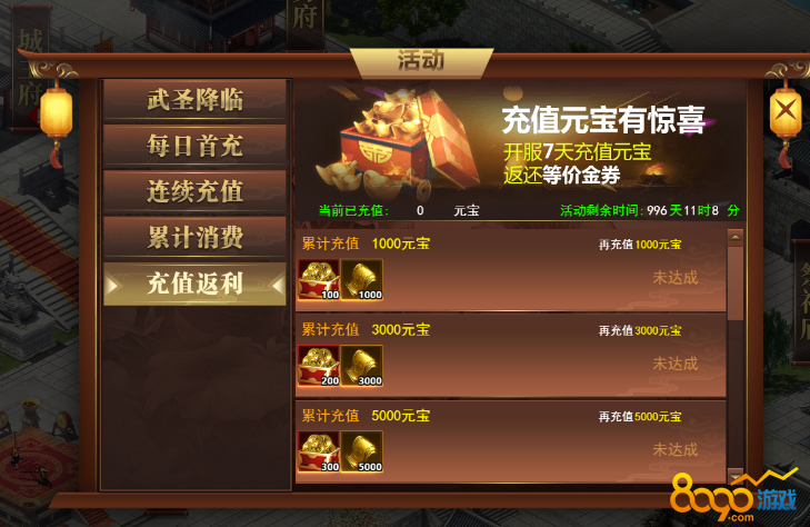 每周一循环,开服前七天是武圣奖励,活动期间,充值对应数量元宝,完成累计充值天数,即可领取相应的档次奖励。