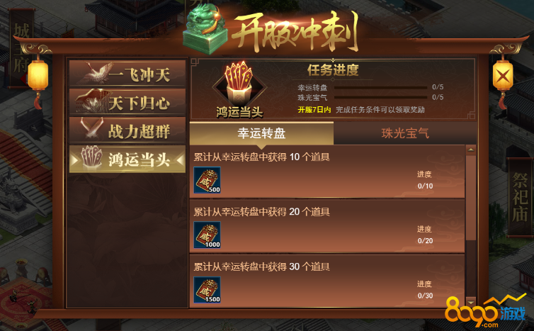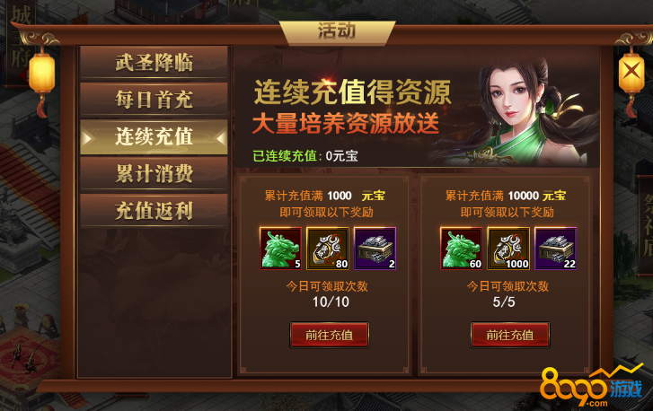 每日连续充值达到条件即可领取奖励,万能魂玉产出,分两档,1000元宝一档的10次,10000元宝一档的5次