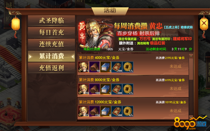 每周一循环,累计消费达到条件即可领取奖励,黄忠黄忠缘装备产出
