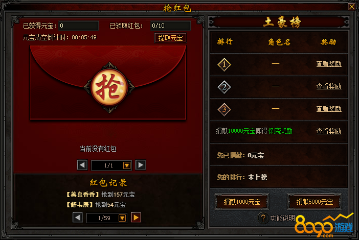【活动内容】玩家可在抢红包界面抢土豪发的红包,同时可捐元宝获得称号奖励。