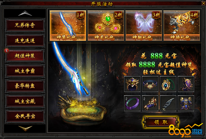 【活动内容】点击查看游戏界面右上角【开服礼包】即可购买各种新区超值礼包。