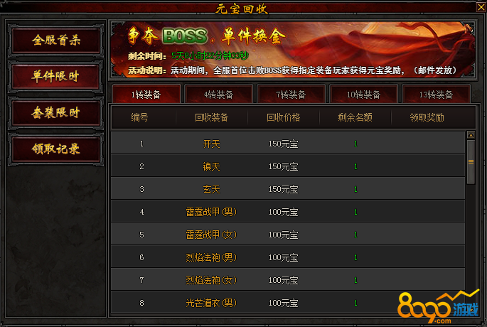 【活动内容】活动期间,全服首位击败BOSS获得指定道具的玩家即可获得元宝奖励!