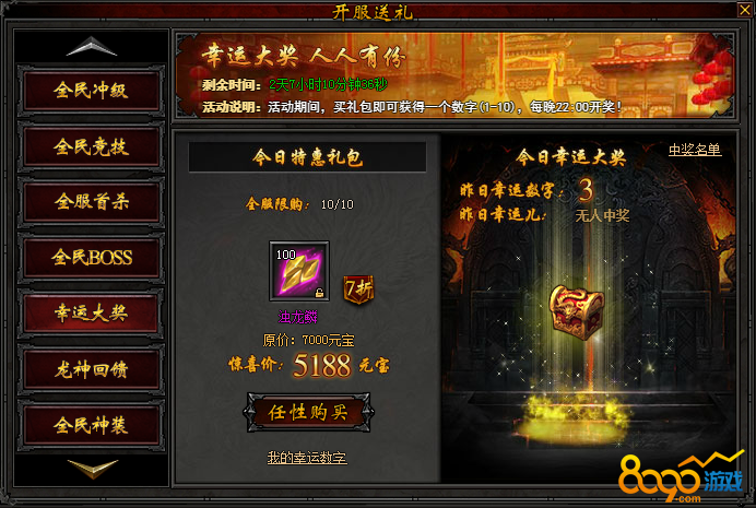 【活动内容】活动期间,买礼包即可获得一个数字(1-10),每晚24:00开奖!幸运数字持有者,将会获得本日幸运大奖,奖励将以邮件的形式发送给中奖者,如果没有中奖者则不发放奖励!