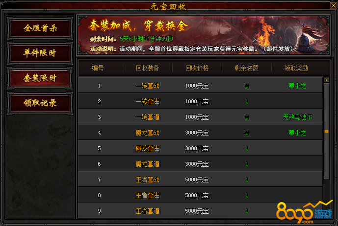 【活动内容】活动期间,全服首位击败穿戴指定套装的玩家即可获得元宝奖励!