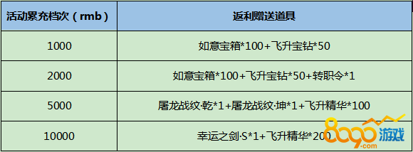 活动规则:活动期间累计领取元宝达到指定价值档次,即可在活动结束后联系客服申请返利道具