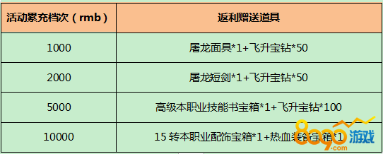 活动规则:活动期间累计领取元宝达到指定价值档次,即可在活动结束后联系客服申请返利道具