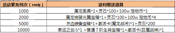 活动规则:活动期间累计领取元宝达到指定价值档次,即可在活动结束后联系客服申请返利道具
