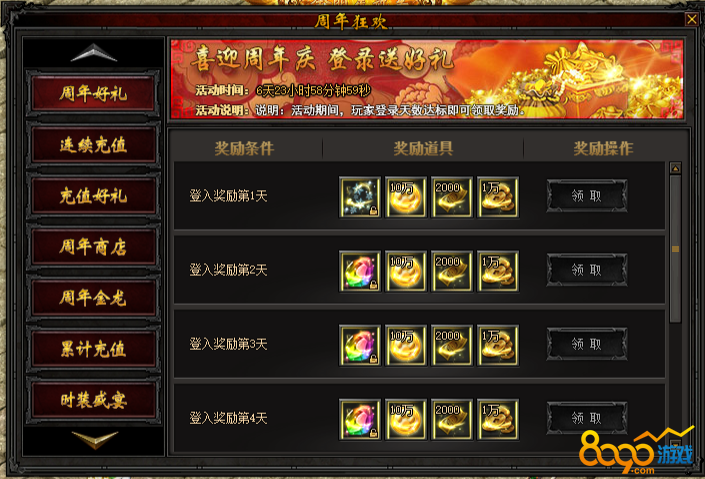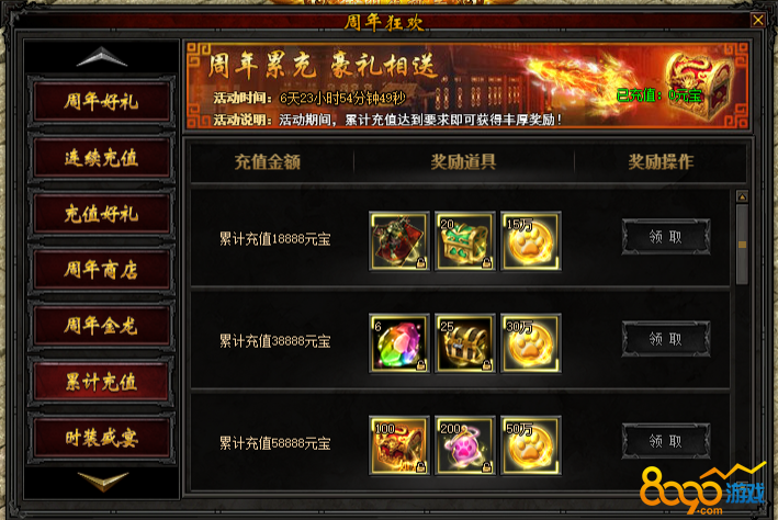 活动规则:活动期间累计领取元宝达到指定价值档次,即可在活动结束后联系客服申请返利道具
