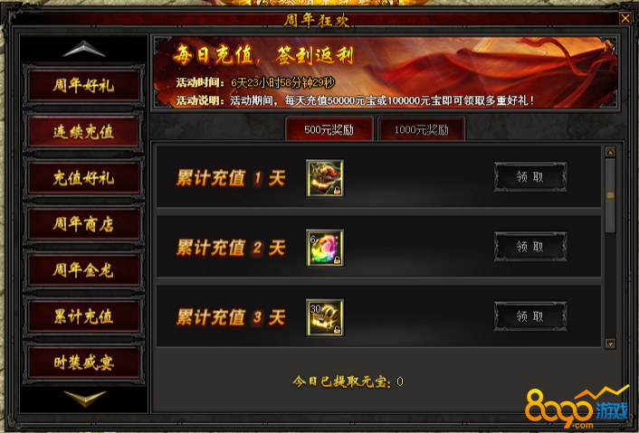 规则:活动期间,玩家每日充值元宝达标,即可领取对应奖励,每日充值。