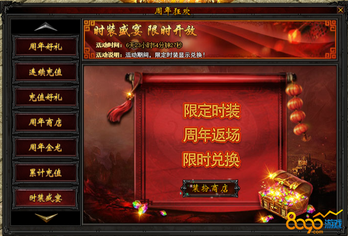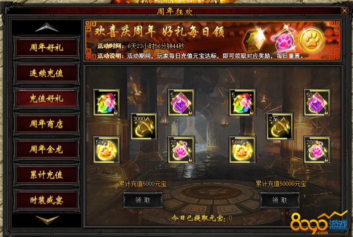 规则:活动期间,玩家连续7日充值50000元宝或100000元宝可领取奖励