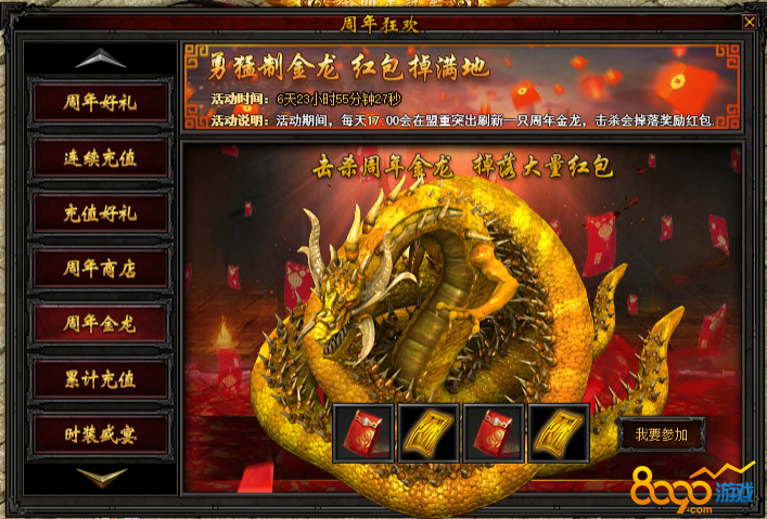 规则:活动期间,每天17:00可前往击杀周年金龙,击杀后会掉落大量周年红包