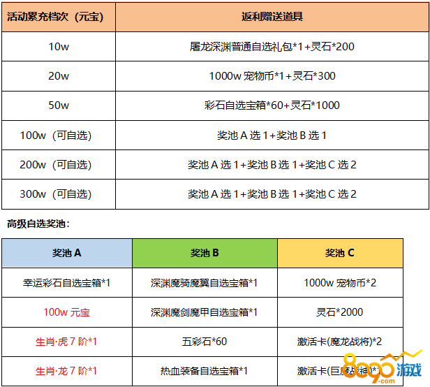 活动规则:活动期间累计领取元宝达到指定价值档次,即可在活动结束后联系客服申请返利道具,累计提取超过100w元宝可进行奖励自选;