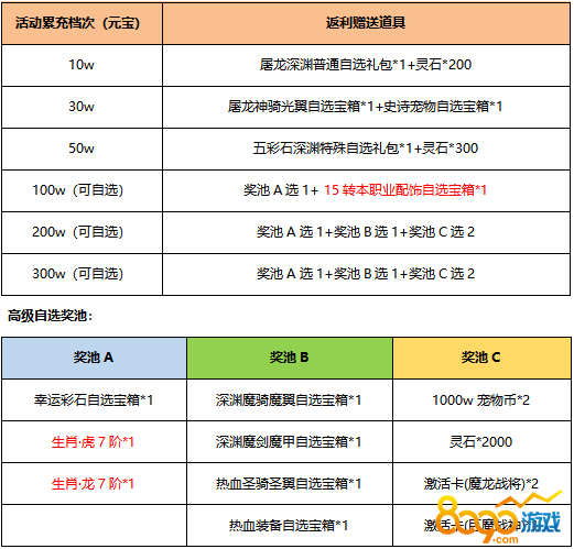 活动规则:活动期间累计领取元宝达到指定价值档次,即可在活动结束后联系客服申请返利道具累计提取超过100w元宝可进行奖励自选;