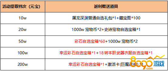 活动规则:活动期间累计提取元宝达到指定价值档次,即可在活动结束后领取福利道具;