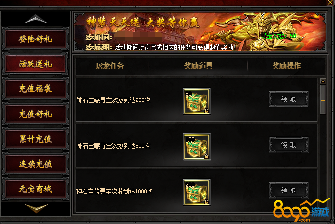 活动期间限时开启神石宝藏,玩家可消耗藏宝图或者元宝进行寻宝,抽取神石、深渊、屠龙道具