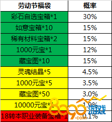 幸运福袋:使用后可从彩石自选宝箱*1、如意宝箱*10、稀有材料宝箱*2、1000元宝*1、藏宝图*10、灵魂结晶*5、1000元宝*5、藏宝图*50、10000元宝*1、18转本职业装备宝箱*1中随机获取一种。