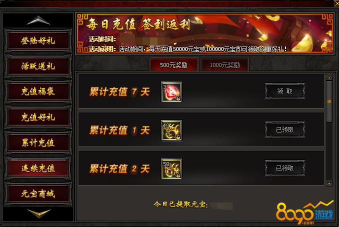 活动规则:活动期间,玩家每日充值元宝达标,即可领取对应奖励,每日重置。