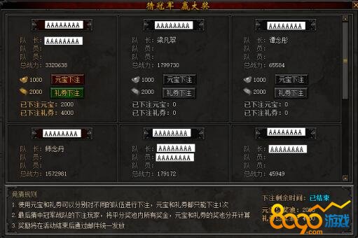 2.最后猜中冠军战队的下注玩家,将平分奖池内所有奖金,元宝和礼券的奖池分开计算