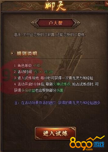 活动时间内,通过NPC“卢大樱”可传送到活动场所。玩家进入到试炼场地后,每10秒可获得大量的青龙灵力以及经验值。