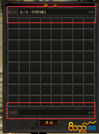 将物品放入摊位后,可以选择修改摊位名(系统默认摊位名为“XXXX的摊位”)、输入有吸引力的广告语后,点击摊位界面中的“摆摊”,