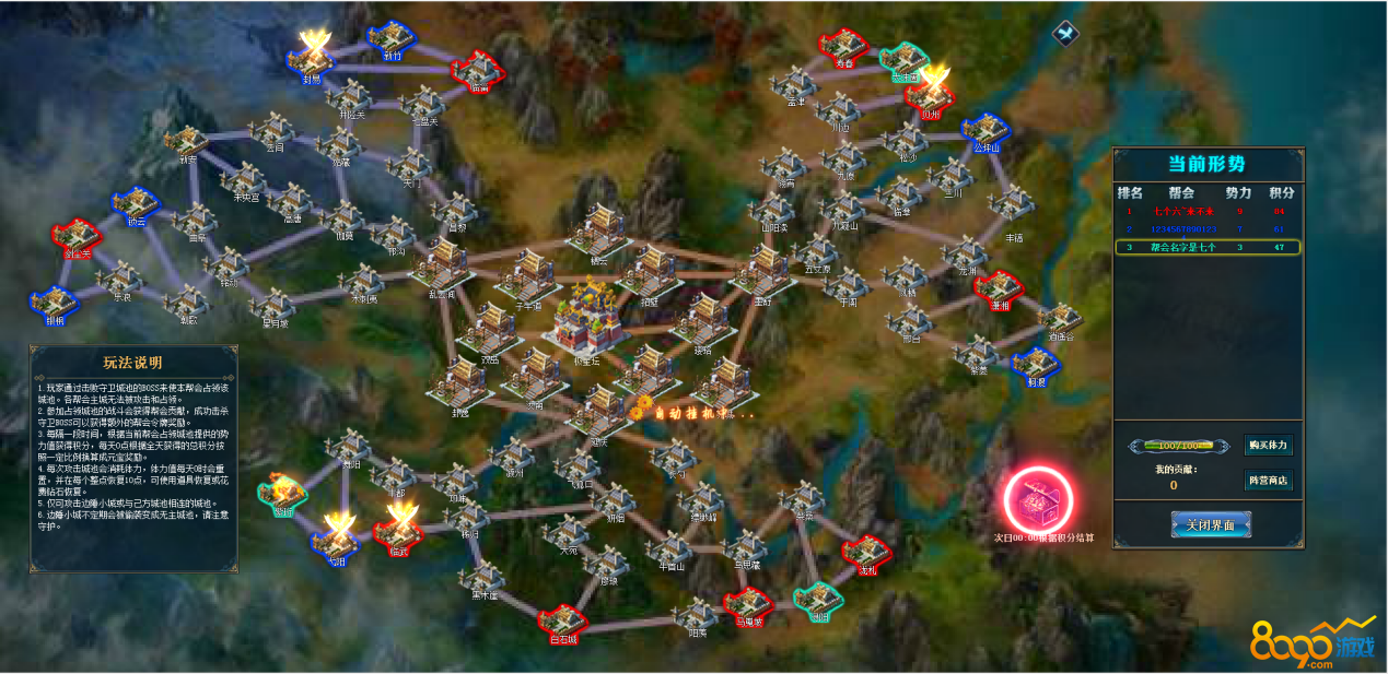 2.每隔一段时间,根据当前帮会占领城池提供的势力值获得积分,每天0点根据全天获得的总积分按照一定比例换算成元宝奖励。