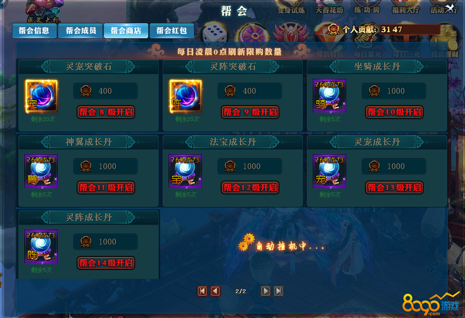 2.参加了上述活动的玩家可以获得帮会贡献令牌,每天捐献令牌和钻石的玩家可以换取个人贡献,并花费贡献在帮会商店里购买稀有商品,