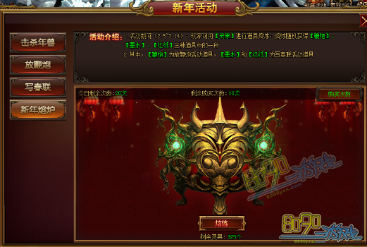 活动内容:活动期间,玩家用道具【灵果】可以在此进行道具熔炼,熔炼随机获得【鞭炮】、【墨水】、【红纸】中的一种。【鞭炮】为放鞭炮活动道具,【墨水】、【红纸】为写春联活动道具