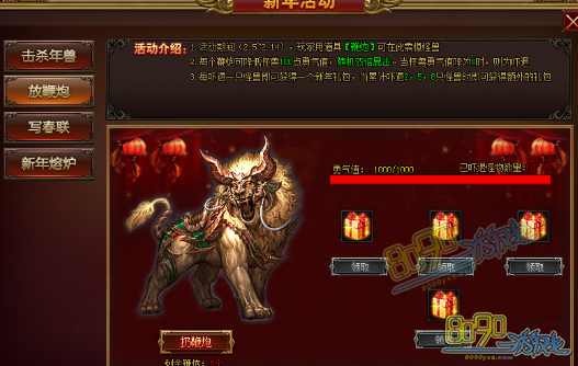 活动内容:活动期间,玩家用道具【鞭炮】可震慑怪兽,每个鞭炮降低怪兽勇气值100点。当怪兽勇气值降为0时,则被吓退。每吓退一只怪兽就可以获得一个新年礼包,当累积吓退2,5,8只怪兽时可获得额外礼包【新年礼包·恭】一个。