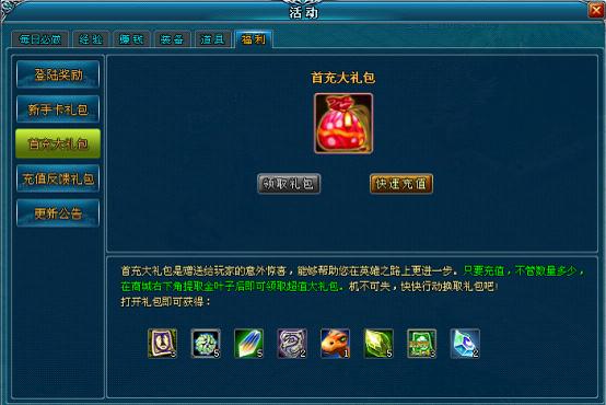 玩家进行首次充值并在游戏中提取出金叶子后,点击小地图旁边的【活】字按钮进入活动面版,再选择【福利】→【首充大礼包】,点击【领取礼包】获得丰厚的奖励;