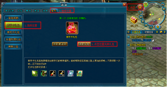 2. 在游戏中点击小地图旁边的【活】字按钮进入活动面版,再选择【福利】→【新手卡礼包】,通过领取到的激活码兑换新手礼包;