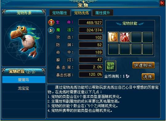 宠物的洗炼需要使用宠物秘纹,点击快速购买可以快速购买宠物秘文,然后点击洗练按钮即可进行洗练,每次洗练会消耗一定的金钱。