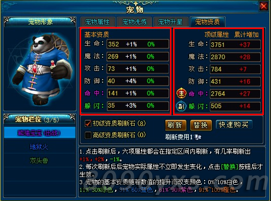 2、使用“初级资质刷新石”进行刷新,宠物的六项属性都会在指定区间内刷新,有几率刷新出+1%,+2%,-1%;