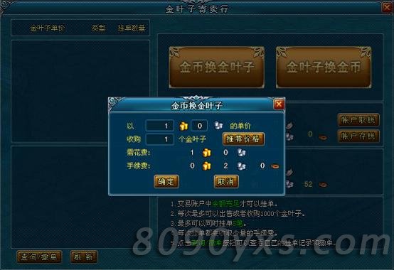 点击金币换金叶子/金叶子换金币标签页,在单价框中输入收购/出售金叶子的单价,单价默认为1金,在收购/出售数量框中的填写金叶子数量;花费/获得金钱栏会显示玩家这笔交易所会花费/获得的金币总数;手续费栏会显示玩家这笔交易所需要交纳给系统的手续费;填写好出售单价和出售金叶子数量后,就可以点击确定按钮开始挂单。