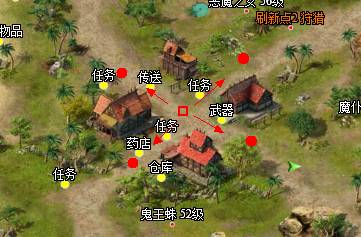 (图中红点为4个能量神坛,方形为恶魔传送门,箭头为小恶魔攻击神坛路线。)