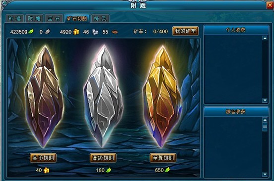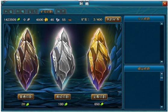 矿石切割所获得的宝石将存放在【我的矿车】中;个人收获和综合收获中将显示玩家切割收获的信息记录。