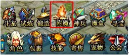 如上图所示,界面主要有斗宠,试炼,锻造,附魔,神兵,墨盒,寻宝,角色,包裹,技能,寄售,宠物,公会。在这中间选择伏魔系统。