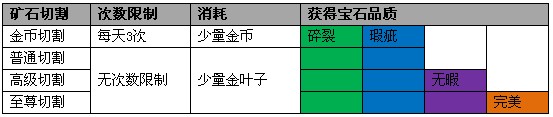 切割类型不同,每天可切割次数、消耗以及获得宝石品质都是不同的。