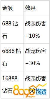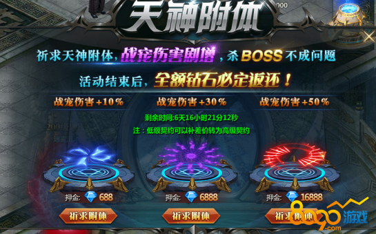 活动内容:开服7天内,玩家通过消耗钻石购买战宠伤害BUFF提升伤害,活动结束后全额返还钻石