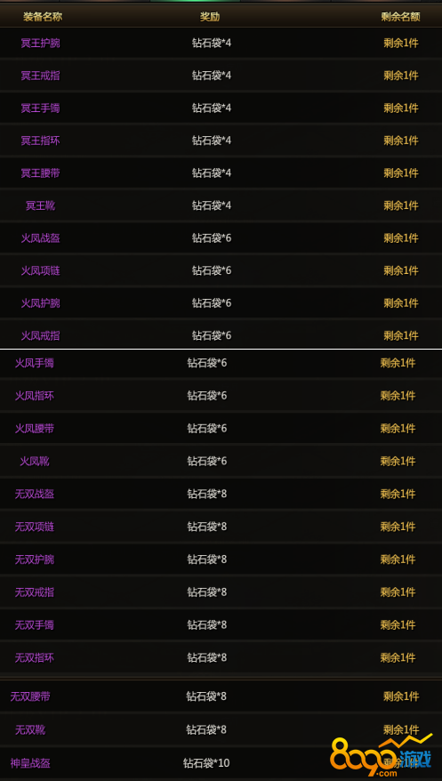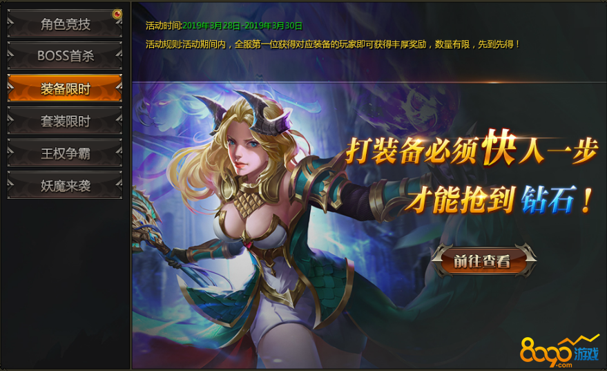 【活动内容】活动期间内,全服第一位获得对应装备的玩家即可获得丰厚奖励,数量有限,先到先得!打装备必须快人一步,才能抢到钻石!